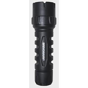 It is a Brinkmann Armormax 1 AA LED flashlight. The label says that the LED is a Cree. The body is some kind of glass reinforced plastic.