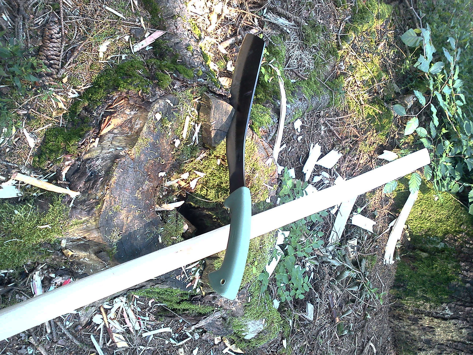 Edge holding has been surprisingly good. The parang hasn't needed resharpening yet, no nicks, edge rolling or any other visible damage. So all in all, it is looking quite promising and goes to show that a blade of that type can be useful in temperate woodland, too.