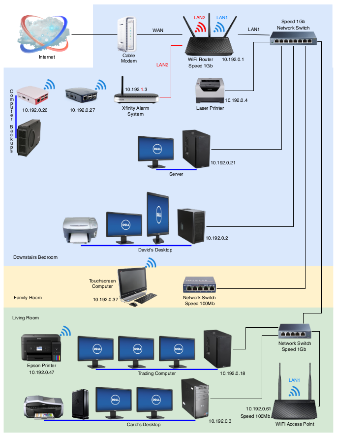 I do have some network diagrams that I made for my wife. Unfortunately they are out of date now. An example of one is below. This particular one shows some of our network as it existed several years ago - it's unique point is using pictures of our actual devices rather than standard network symbols. I was hoping that might help my wife, who wouldn't normally know a router from an access point from a switch from a modem. The particular drawing below listed IP addresses (that's still accurate) of each device. Of minimal use for my wife, but she has the knowledge of "where things that look like that" are located, and she could get one of my computer savvy friends to help her understand what those "funny sequences of numbers" might mean.